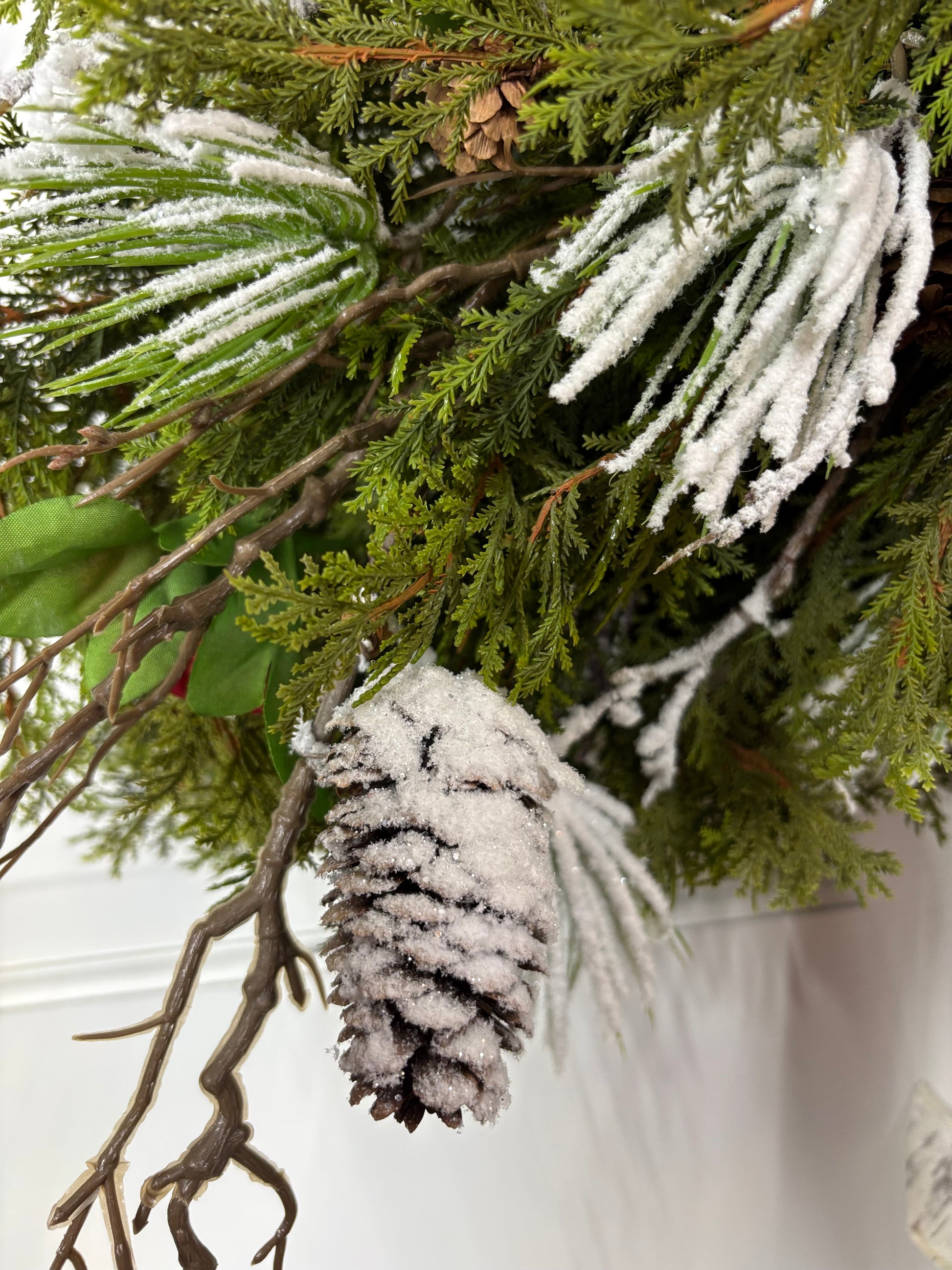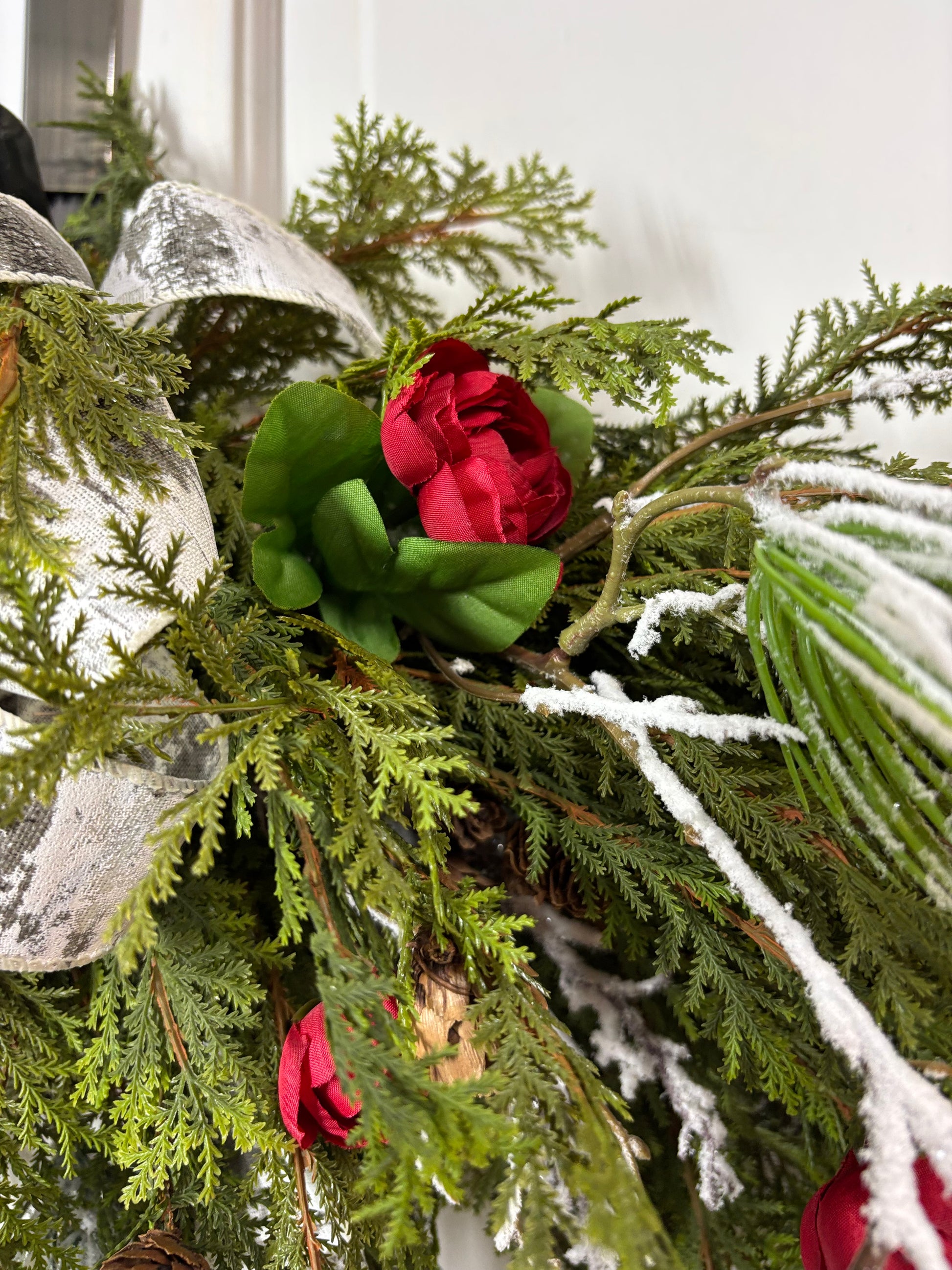 This lively cedar swag brings a festive twist with lifelike cedar branches, cheerful red ranunculus, snowy stems, and charming pinecones. Finished with a playful birch ribbon, its horizontal design adds a fresh, woodland-inspired touch to any space, perfect for spreading holiday joy with a natural flair.