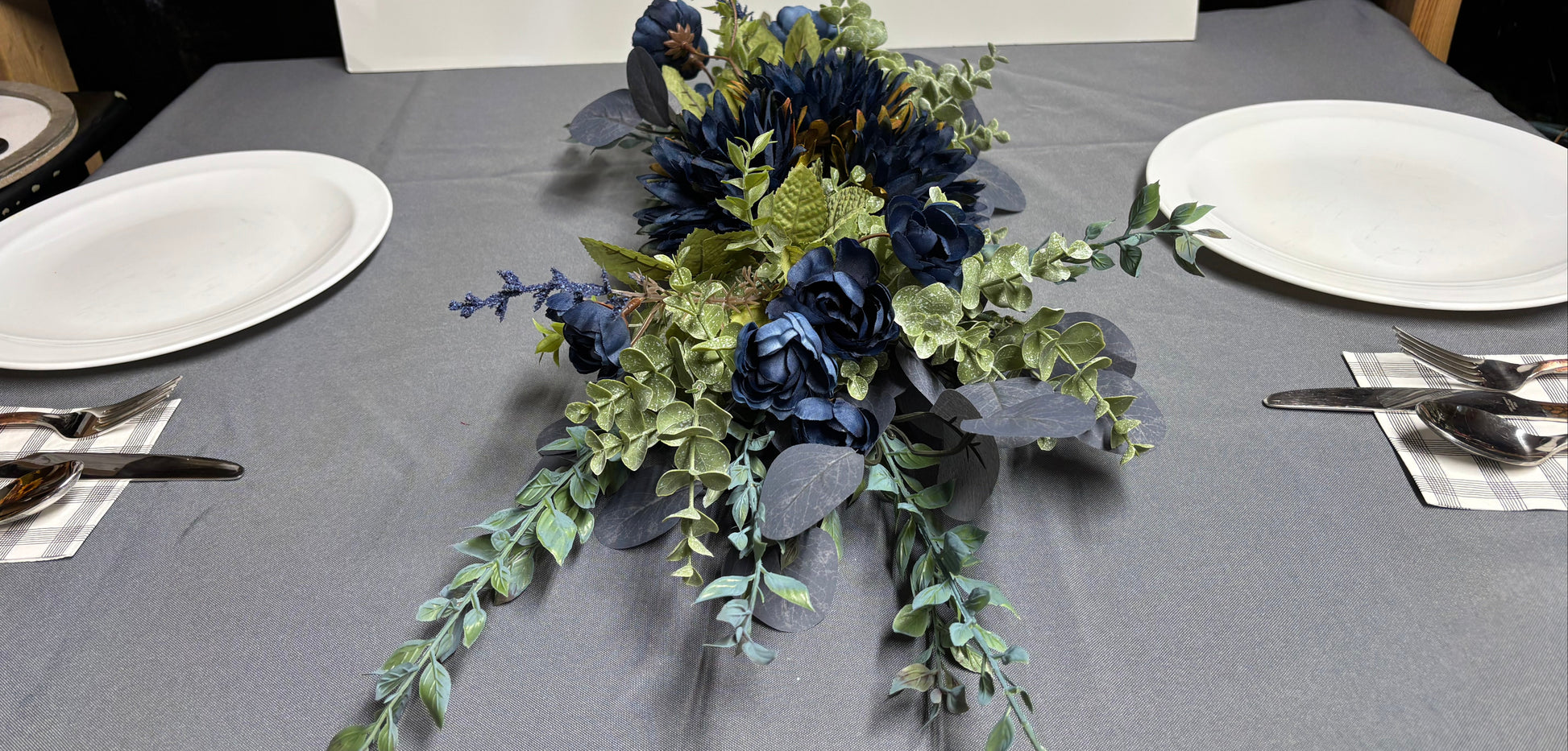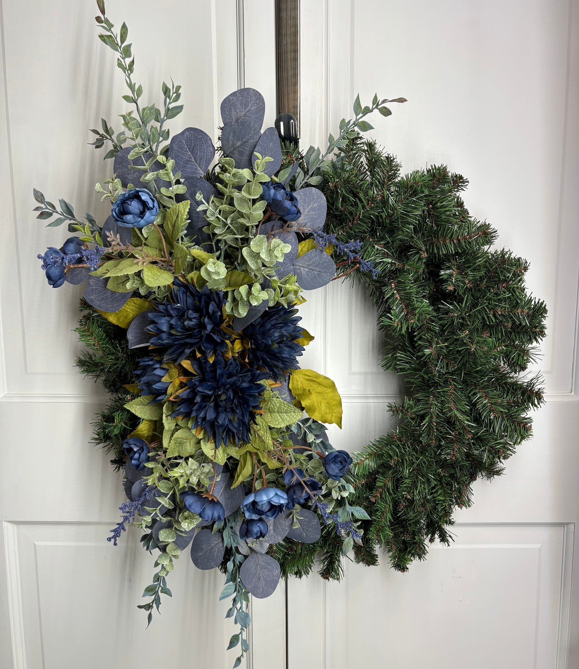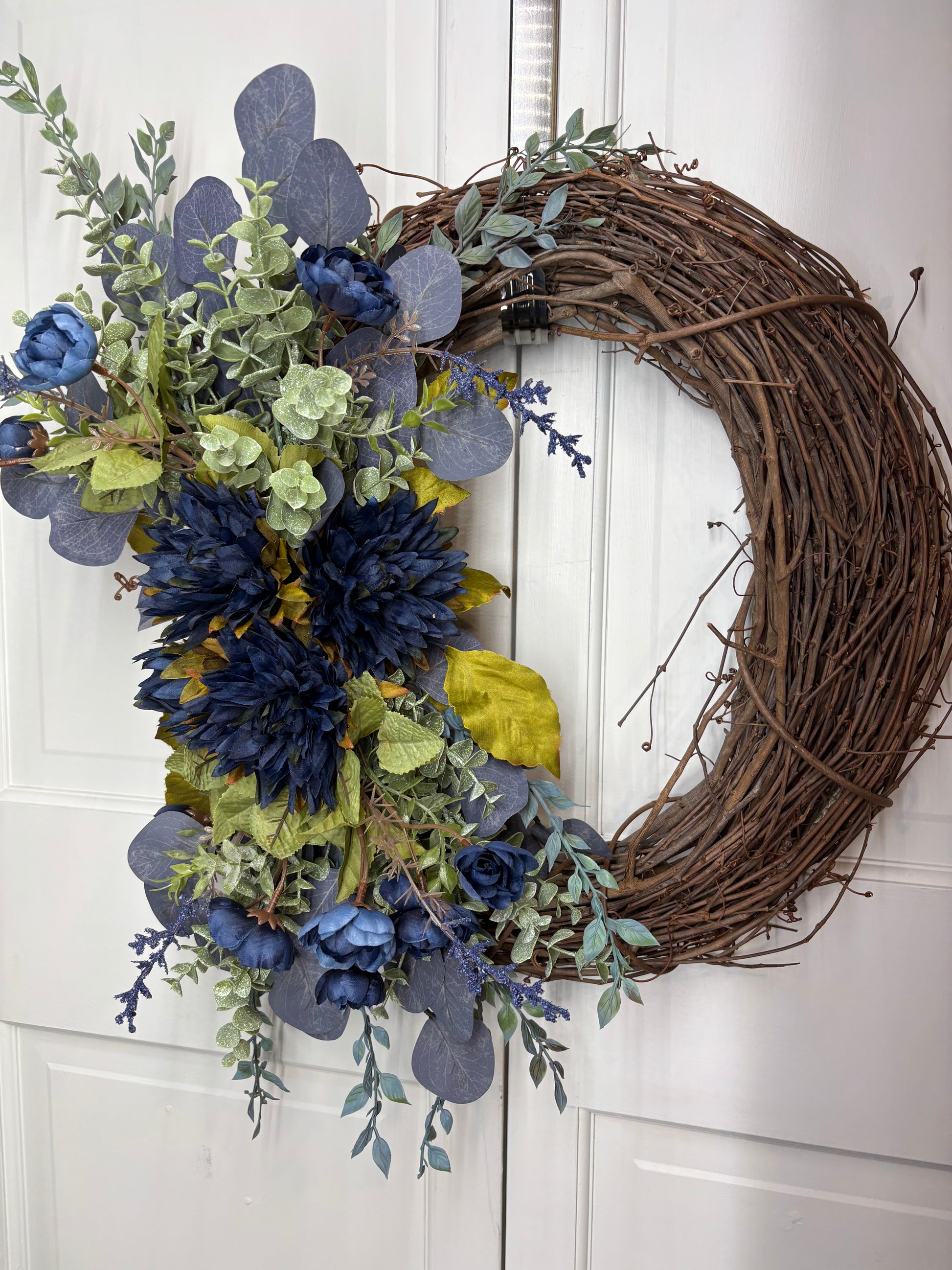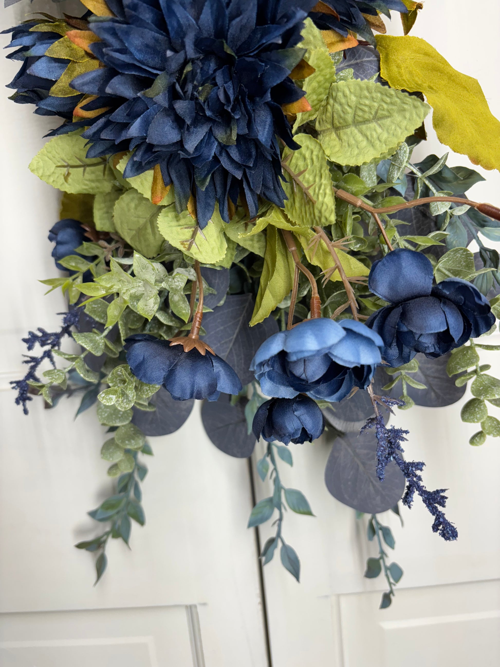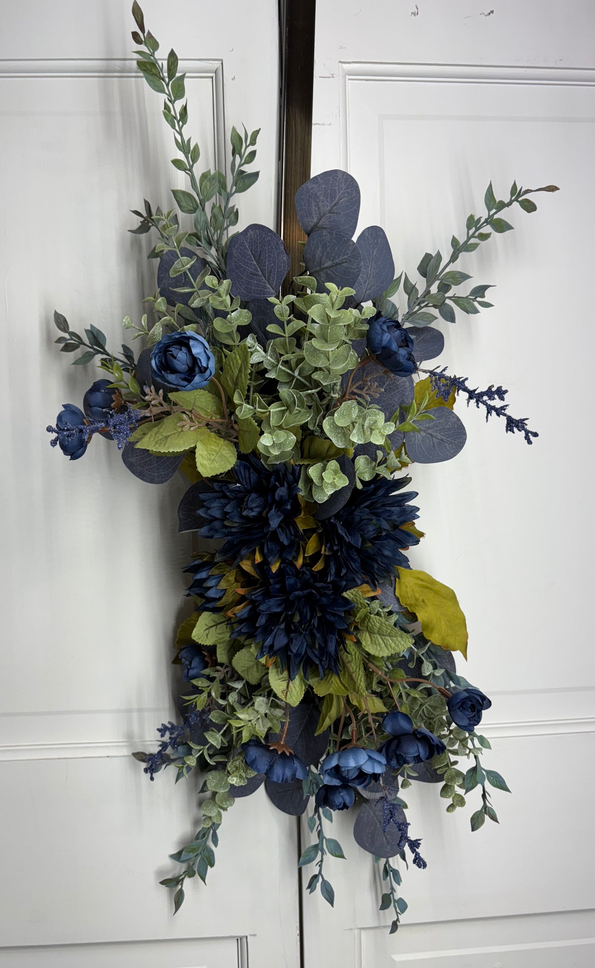 - Transform your space with the Versa Blue—a captivating swag that brings sophisticated elegance to any room. Crafted with premium ranunculus, eucalyptus, and dahlias in rich blue hues, complemented by calming sage green accents, this piece creates an instant focal point. This versatile design works beautifully as a hanging swag, a table centerpiece, added to a grapevine, or pine wreath base. Elevate your décor with this bluesy floral arrangement .
