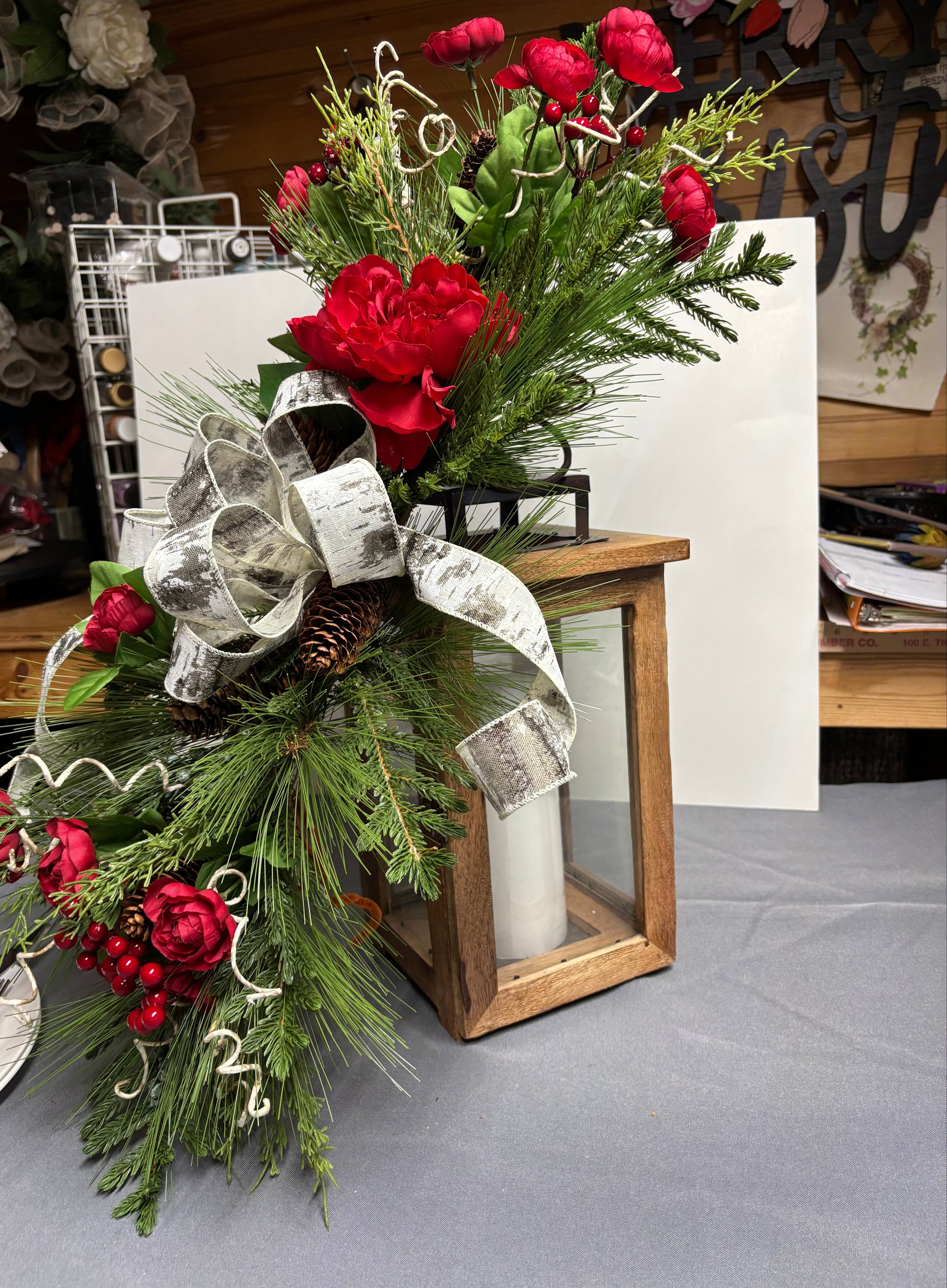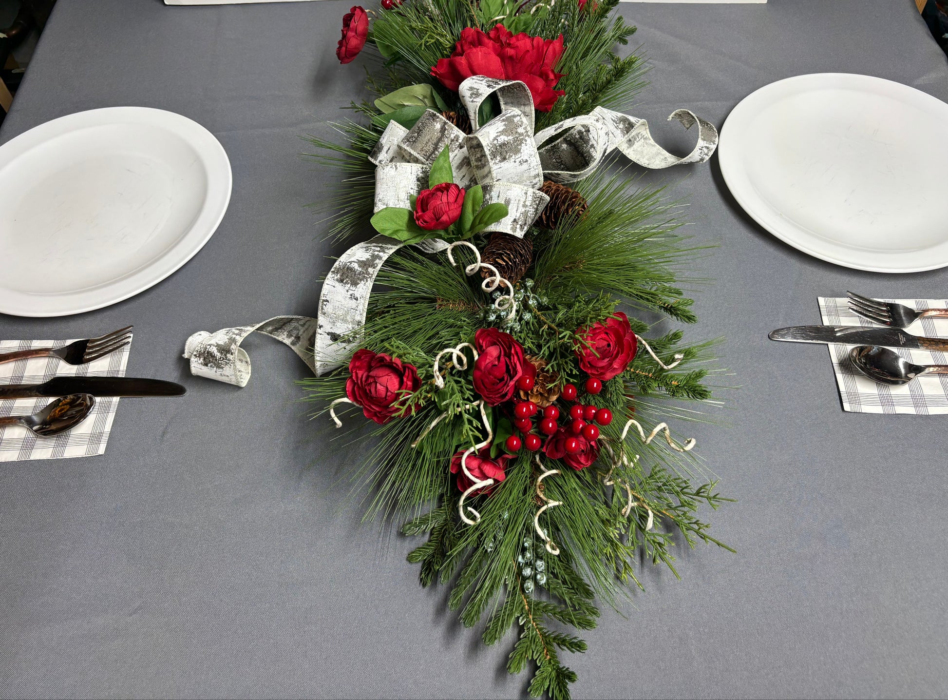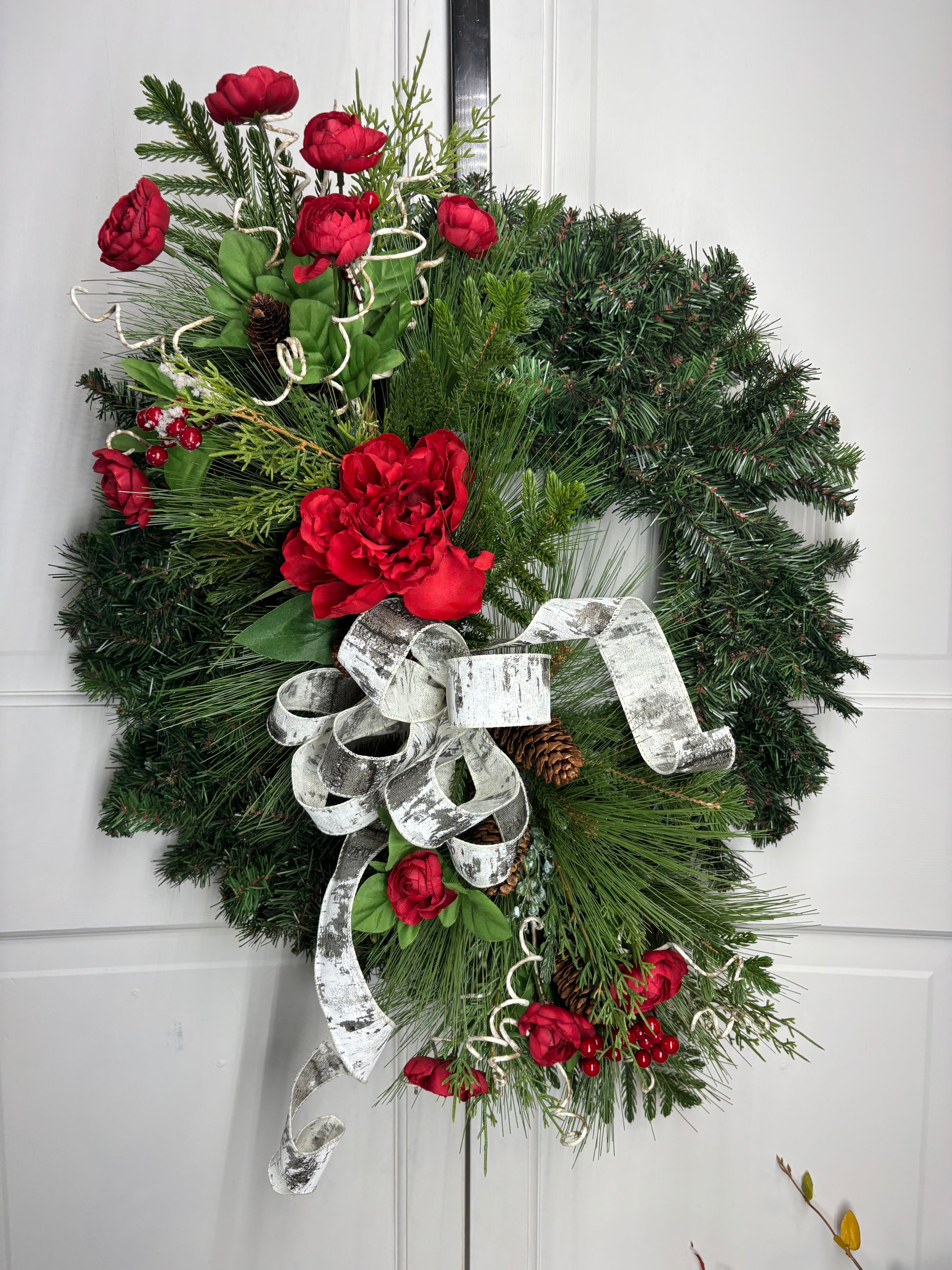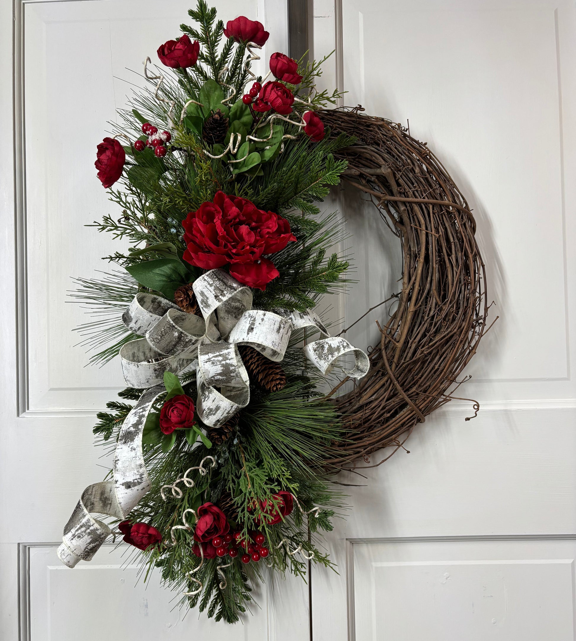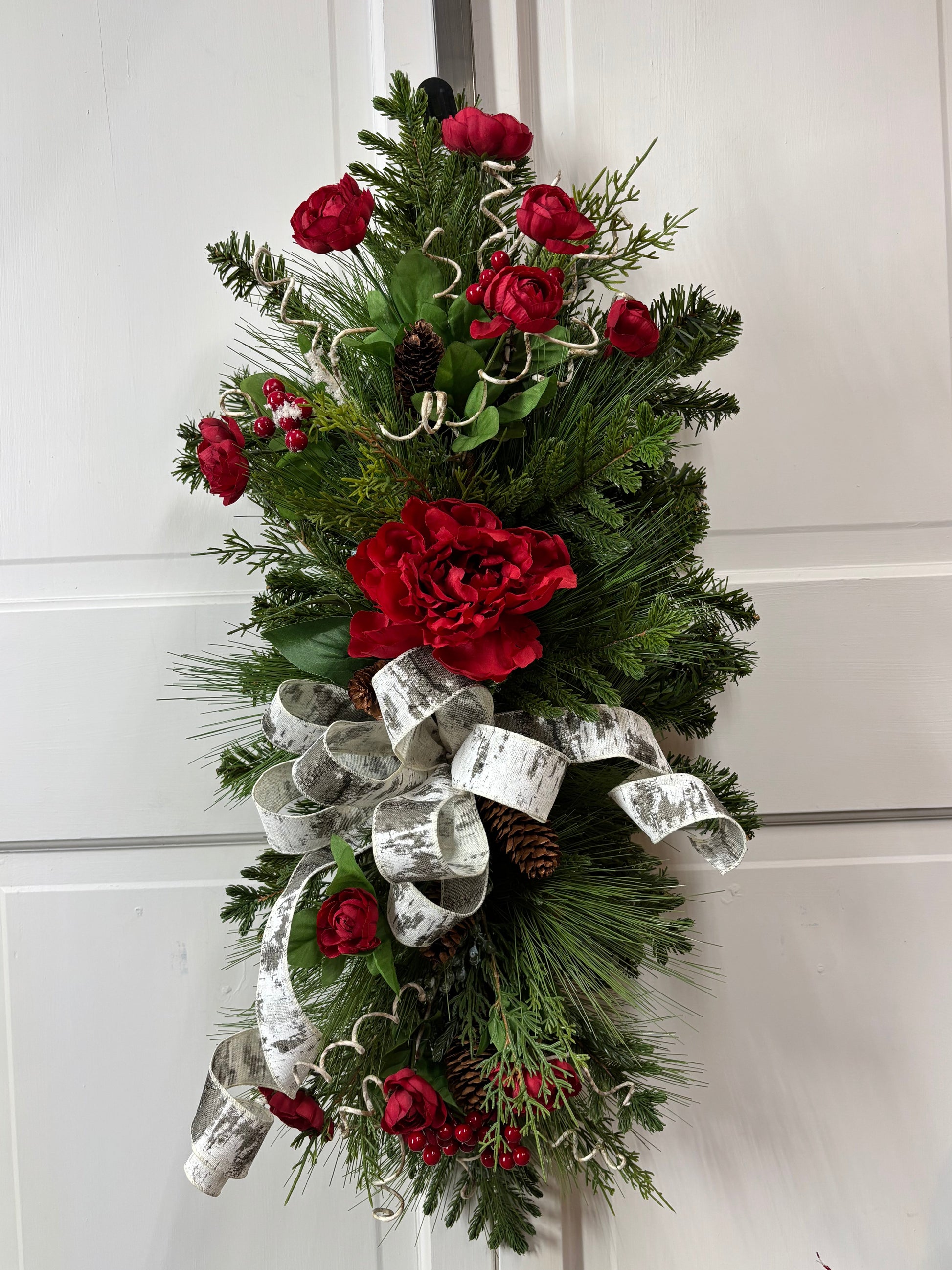 - This versatile swag brings the drama! Featuring a stunning red peony as the star, complemented by cheerful red mini roses, birch twigs, and feathery long needle pine, all tied together with a charming birch ribbon bow. The beauty of this design? It's a total shapeshifter. Attach it to a grapevine wreath, drape it over a lantern, secure it to pine wreath or let it stand proudly on its own. Mixed greens add lush texture throughout. Perfect for adding festive flair —whether you're decorating a mantel, doorway, or creating an eye-catching wall display. One swag, endless possibilities!