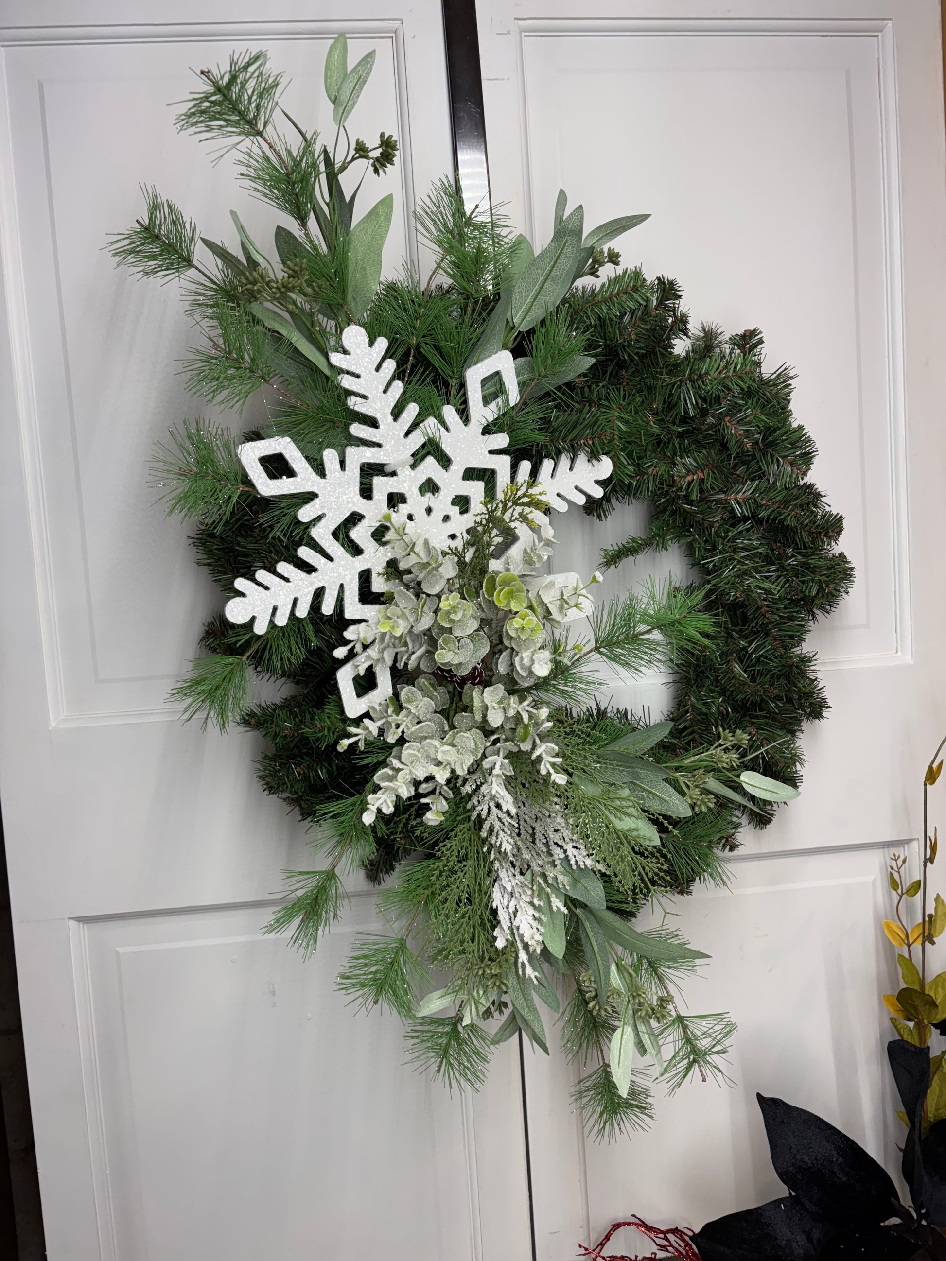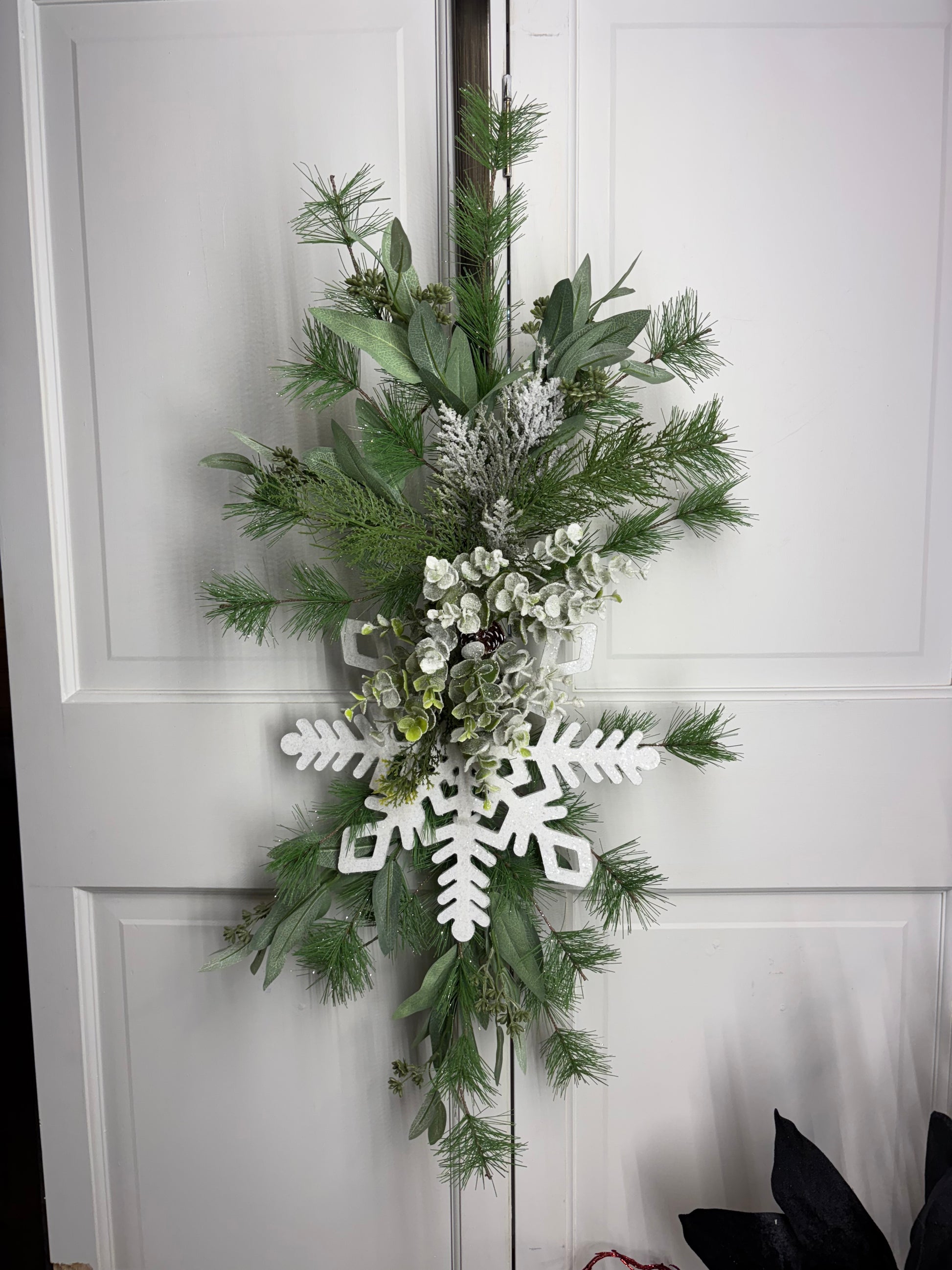 Transform your space into a winter wonderland with this captivating swag, where glittered pine and long leaf eucalyptus blend seamlessly with snowy greens and a dazzling sparkly snowflake. Each element works together to create a sophisticated holiday statement that radiates seasonal charm . Whether adorning your entryway, fireplace, or added to a wreath base, this versatile piece brings festive shimmer to any setting.