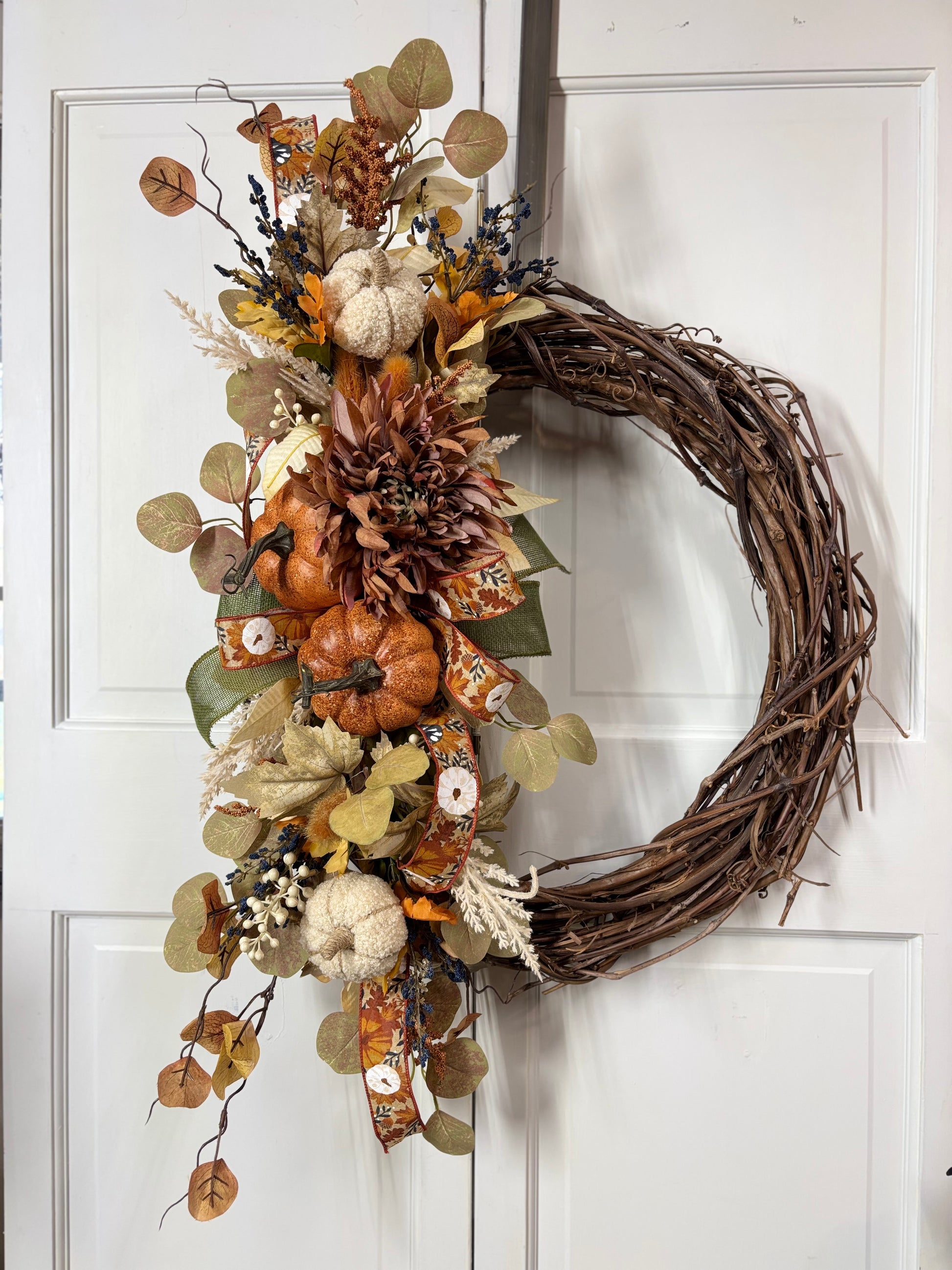 Elevate your fall decor with this 33" versatile pumpkin swag, perfect for Thanksgiving. This stand-alone hanging swag, can be attached to a natural grapevine base, creating an instant wreath or, used as a centerpiece with effortless charm. Its soft, muted colors blend beautifully with autumn themes, adding a cozy, inviting touch to any room or entryway.